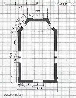 - ↑ Budowla mogła być pierwotnie oszkarpowana – jej forma mogła ulec zmianie w czasie prac renowacyjnych z 1916 r. Nie wiadomo, na czym dokładnie polegał przeprowadzony wówcza remont[4].
