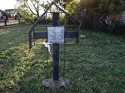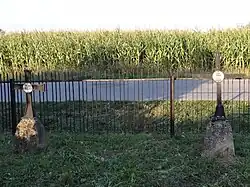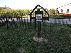 - żelaznych krzyże lotaryńske, nakryte ząbkowanym daszkiem, o ramionach połączonych żelazną kratą,