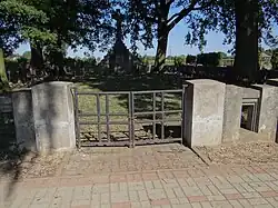 Znajduje się na cmentarzu parafialnym, w pobliżu kościoła. Jego projektantem był Johann Watzal. Cmentarz zbudowany jest na planie prostokąta. Ogrodzony jest charakterystycznym murem wykonanym z betonowych, ażurowych elementów. Wejście przez bramkę zamykaną dwuskrzydłową furtką z metalowych rur. Od bramy szeroka alejka prowadząca do pomnika centralnego. Jest to wkomponowany w tylne ogrodzenie cmentarza duży betonowy krzyż łaciński z betonowa ścianą, na której zamontowano tablicę inskrypcyjną z napisem[3]: