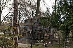Północną ścianę cmentarza tworzy wysoki, betonowy prawosławny krzyż na którym umieszczono krzyż żeliwny z datą 1914. Projektował nekropolię Franz Stark.