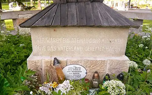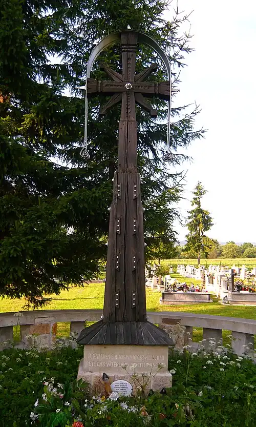 Na cokole krzyża centralnego umieszczona została inskrypcja w języku niemieckim: