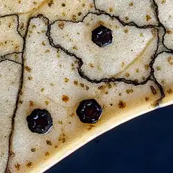 Apotecja o średnicy 0,5–1 mm, rozproszone w wyraźnie wyblakłych plamach na liściach, czasami ograniczone czarną strefą,. Powstają śródnaskórkowo, są czworokątne do sześciokątnych, czarne, błyszczące, z wyraźnym gwiaździstym aparatem apikalnym zbudowanych z jaśniej zabarwionych komórek, otwierają się zębami, odsłaniając matowożółte hymenium. Ściana o grubości około 30 µm, zbudowane z czarniawych komórek o średnicy 5–6 µm, bez peryfiz. Podkładka o grubości około 5 µm, czarniawa. Występują nitkowate i bezprzegrodowe parafizy, stopniowo rozszerzające się na wierzchołku do około 2 µm, otoczone galaretowatą otoczką. Worki 70–105 × 8–10 µm, walcowato-maczugowate, o krótkiej szypułce, cienkościenne, bez wyraźnego wierzchołkowego otworu lub pierścienia, nie barwiące się jodem, 8 zarodnikowe. Askospory ułożone w wiązkę, niespiralnie zwinięte, 45–65 × około 2 µm, nitkowate, lekko zwężające się ku podstawie, bezprzegrodowe, szkliste, cienkościenne, z wąską galaretowatą otoczką[4].