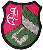 - Herb: tarcza podzielona w odwróconą rosochę. W części pierwszej znajduje się srebrny cyrkiel korporacyjny w polu amarantowym, druga część podzielona jest na trzy z prawa w skos polami amarantowym, zielonym i srebrnym, a w części trzeciej znajduje się ramię zbrojne z mieczem w polu zielonym.