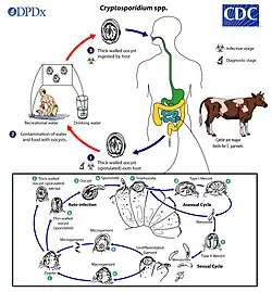 Oocysty zawierające sporozoity[1][2] dostają się do organizmu wraz z pokarmem, wodą lub unoszącym się w powietrzu kurzem[2]. W jelicie cienkim sporozoity uwalniają się z oocyst i przylegają do enterocytów[1][2], przez które niemal od razu zostają otoczone, tworząc wakuolę pasożytniczą (ang. parasitophorous vacuole). Sporozoit przekształca się w trofozoit. Po 1–8 dniach zachodzi schizogonia, w wyniku której powstaje 8 merozoitów. Te, po uwolnieniu, zakażają następne enterocyty. Następnie powstają w pełni dojrzałe schizonty (merocyty), każdy z nich zawiera po 4 merozoity, które przekształcają się w makrogametocyty i mikrogametocyty[2] (gamogonia)[1], łączące się w zygotę. Kolejnym etapem jest przekształcenie się zygoty w oocystę[1][2], w której powstają 4 sporozoity (sporogonia)[2]. Większość oocyst jest wydalana wraz z kałem do środowiska zewnętrznego[1][2], jednak około 20% z nich (o znacznie cieńszej otoczce)[2] pęka niemal natychmiast powodując dalszy rozwój zakażenia (autoinwazja)[1][2].