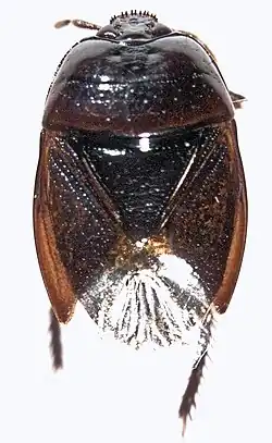 Pluskwiaki o ciele czarnym, czarnobrązowym lub brązowym, bez jaśniejszych wzorów czy plam[1]. Półokrągła do prawie trójkątnej głowa ma całobrzegie krawędzie. Płytki żuwaczkowe zaopatrzone są w chetopory. Szersze niż dłuższe przedplecze ma chetopory na brzegach bocznych[2]. Tarczka jest trójkątna[3], szersza niż dłuższa lub tak szeroka jak długa, zwykle nie dochodząca do połowy długości półpokryw. Te z kolei mają wyodrębnione międzykrywki, egzokoria i mezokoria. Ujścia gruczołów zapachowych zatułowia przedłużone są bocznie w pasma wygładzonego oskórka, zwykle sięgając prawie do krawędzi segmentu[2]. Wszystkie odnóża zwieńczone są stopami o członie drugim nieodbiegającym zbytnio średnicą od pierwszego i trzeciego[2][3]. Genitalia samca odznaczają się prąciem o bardzo słabo zesklerotyzowanej i pozbawionej pigmentacji fallotece[2].