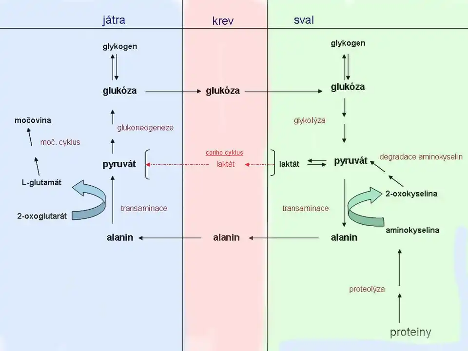 Glukozo-6-fosforan wchodzi na szlak glikolizy, którego produktem jest pirogronian. Związek ten, reagując z aminokwasem, może zostać dzięki aminotransferazie (transaminazie) przekształcony w aminokwas alaninę, grupa karbonylowa z drugiego atomu węgla pirogronianu przeniesie się zaś w miejsce byłej grupy aminowej (−NH