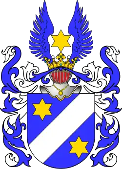 W klejnocie gwiazda złota między dwoma skrzydłami orlimi błękitnymi.