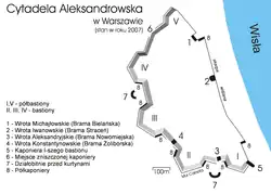 ![]() Cytadela Warszawska (widok od strony wschodniej). Oznaczenia literowe: A − Muzeum Wojska Polskiego, B − Muzeum Historii Polski, C − Muzeum X Pawilonu Cytadeli, D − Brama Straceń | |
