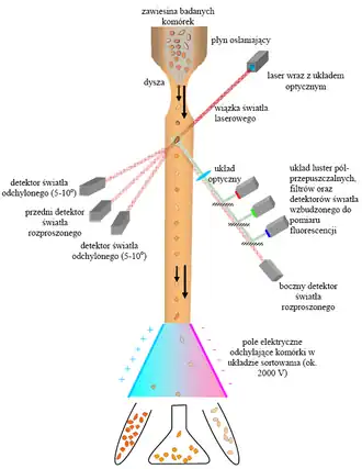 W cytometrze przepływowym zawiesina odpowiednio zabarwionych komórek (rozcieńczona krew, próbka cytologiczna pobrana metodą biopsji aspiracyjnej, próbka płynu z jamy ciała, itp.) jest wytłaczana w otoczce płynu osłaniającego przez specjalną dyszę, w postaci laminarnie płynącego, cienkiego strumienia zawierającego rząd pojedynczych komórek. Jest to tzw. ogniskowanie hydrodynamiczne, w którym płyn osłaniający płynie szybciej, niż centralny strumień z komórkami. Strumień o średnicy ok. 30 mikrometrów przepływa przed optoelektronicznymi układami rejestrującymi (fotokomórkami lub fotopowielaczami), w którym pojedyncze komórki są oświetlane przez cienkie wiązki monochromatycznego, spolaryzowanego światła (lasera, wycinki widma światła lampy rtęciowej).