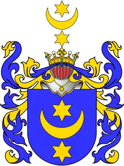 W polu błękitnym półksiężyc złoty, między dwiema takimiż gwiazdami w słup.