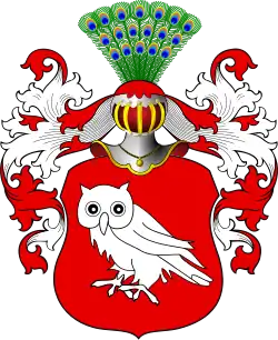 W polu czerwonym sowa srebrna. Klejnot: nad hełmem bez korony ogon pawi. Labry czerwone, podbite srebrem.