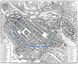 - ↑ Pierwsze założenie miasta, w wiekach X-XII najpewniej było ufortyfikowane jedynie wałami ziemnymi i nie było otoczone fosą. Ten system obrony wystarczający był wobec oblężenia Wrocławia w 1109 przez wojska króla niemieckiegoHenryka V, ale w obliczu najazdu mongolskiego w 1241 mieszkańcy opuścili miasto, które zostało złupione przez najeźdźców i puszczone z dymem. Po wycofaniu się Mongołów miasto odbudowano i niezwłocznie przystąpiono do tworzenia nowych, skuteczniejszych niż dotąd umocnień obronnych.