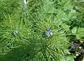- Duże, promieniste, otoczone kilkoma wielokrotnie postrzępionymi liśćmi (pierzastosieczne przysadki)[5][6]. Są jasnoniebieskie, ale zdarzają się białe, a u ozdobnych odmian również w innych kolorach. Zewnętrzne listki okwiatu są zazębione i mają zielone zakończenia nerwów. Wewnątrz kwiatu znajdują się dwuwargowe miodniki, przy czym ich wewnętrzna warga jest jajowata i tępa[6].