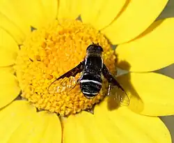 Muchówka o ciele długości od 4,5 do 11 mm. Oskórek na całym ciele jest czarny. Głowę porastają ochrowożółte łuski i czarne włoski. Twarz jest dziobowato przedłużona. Czułki mają człon trzeci o kształcie gruszkowatym. Tułów ma krezę z włosków ubarwioną w górnej części żółto. Skrzydła mają w części nasadowo-przedniej rozległe zaczernienie obejmujące całość obu komórek nasadowych i część drugiej komórki kubitalnej, pozbawione przejrzystych okienek. Odnóża mają golenie pozbawione kolców, a stopy pozbawione przylg i zwieńczone prostej budowy pazurkami. Ubarwienie odnóży jest czarne z brunatnożółtymi łuskami. Odwłok ma owłosienie i opylenie czarne z kępkami białych włosków na bokach pierwszego i drugiego tergitu, przepaskami z białych łusek na tylnych krawędziach tergitów pierwszego, trzeciego i szóstego oraz ze złociście żółtymi łuskami na sternitach. Samica ma pokładełko włącznie z kolcami ubarwione czarno[3].