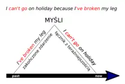 - Mówiący odnosi się do przyszłości w zdaniach podrzędnych okolicznikowych[18]: Can I borrow your pen? – No, you must wait until I`ve finished. → Mogę pożyczyć twoje pióro? Nie, musisz zaczekać, aż skończę.