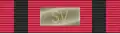 Medal zawieszono na wstążce o szer. 38 mm w kolorze czerwonym, z dwoma czarnymi paskami o szer. 4 mm, umieszczonymi po bokach w odległości 4 mm od krawędzi.