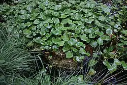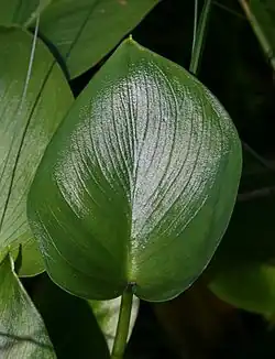 - Liście pojawiają się w dwóch szeregach na całej długości kłącza, skupione przy jego wierzchołku[9]. Ogonki liściowe gąbczaste[12], wzniesione, o długości (5-)10–30(-40) cm. U nasady liści długie i wolne języczki. Blaszki liściowe połyskliwe, jasnozielone, całobrzegie, szeroko jajowate do niemal okrągłych, z sercowatą nasadą i spiczastym lub kończykowatym wierzchołkiem, o wymiarach (5-)6–12(-14)×4–11(-12) cm[14][7]. Użyłkowanie liścia łukowate[11]. Brzegi liścia zwykle zawijają się nieco do środka[15].
