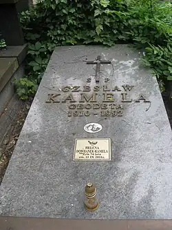 - ↑ Cmentarz Stare Powązki: CZESŁAW KAMELA, [w:] Warszawskie Zabytkowe Pomniki Nagrobne [dostęp 2019-11-07].
