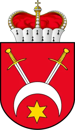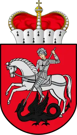 W polu czerwonem na koniu białym jeździec nagi przebija dzidą wywróconego smoka czarnego. Tarczę osłania płaszcz czerwony podbity gronostajami i mitrą.