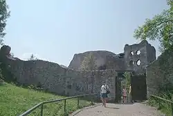 Ruiny gotyckiego zamku z XIV wieku w granicach rezerwatu krajobrazowego.
