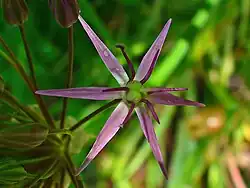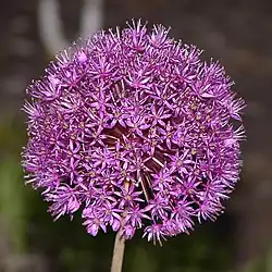 - Zebrane w gęsty, w miarę przekwitania rozluźniający się, średnicy do 25–30 cm baldachy pozorne na szczycie łodygi, liczące do 80 kwiatów średnicy do 4 cm. Przed rozwinięciem kwiatostan osłonięty jest błoniastą, białawą okrywą. Szypułki wydłużają się w czasie kwitnienia do 5–10 cm, po przekwitnieniu twardnieją. Działki lila (u roślin uprawnych często ciemniejsze, do purpurowych) z metalicznym połyskiem. Zalążnia trójdzielna, zielona, silnie uwydatniająca się w przekwitających kwiatach.