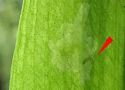 - Pierwszy liść rozwija się po przeciwnej stronie pędu w stosunku do szypuły kwiatostanowej wyrastającej w poprzednim sezonie wegetacyjnym. Tworzy niewielką, bezbarwną pochwę, chroniącą kolejne liście podczas ich wzrostu przez glebę. Z jego kąta wyrasta też pęd kwiatostanowy[6]. Liście asymilacyjne są odziomkowe, zazwyczaj dwa, czasem trzy lub jeden[6]. Długoogonkowe, z blaszką kształtu eliptyczno-lancetowatego, zaostrzoną na końcu i zbiegającą u nasady[11], długą na ok. 25 cm[14], szeroką na 2–6 cm, płaską, cienką, o soczyście zielonej barwie. Ogonki są skręcone w części podziemnej, w wyniku czego morfologicznie dolna, ciemniejsza powierzchnia liści skierowana jest ku górze[6].