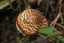 Średnica 1–4,5 cm, początkowo wypukły, potem płaski z tępym garbkiem. Powierzchnia o barwie pomarańczowobrązowej do czerwonobrązowej, popękana koncentrycznie na ziarniste łuseczki[4] na białym lub kremowym tle. Łuseczki włókniste z odgiętymi końcami. Brzeg jaśniejszy i mniej łuseczkowaty[5].