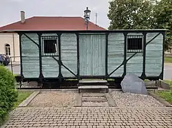 Między drogą a dworcem znajduje się niewielki parking wraz ze stanowiskami dla autobusów i postojem taksówek. Pośrodku parkingu stoi wagon, który jest pomnikiem złożonym w hołdzie Sybirakom deportowanym stamtąd w latach 1940–41.