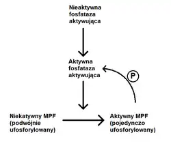 Czynnik pobudzający dojrzewanie działa na zasadzie dodatniego sprzężenia zwrotnego. Treonina-161 aktywuje podwójnie ufosforylowany MPF poprzez odczepienie jednej reszty fosforanowej. Dołącza ona do nieaktywnej fosfatazy aktywującej tym samym stymulując ją. Aktywna fosfataza pobudza nieaktywny MPF i cykl się powtarza, dopóki wszystkie kompleksy nie zostaną aktywowane[2].