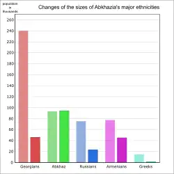Przed wybuchem pierwszej wojny w Abchazji 1992 roku Gruzini stanowili prawie połowę ludności samozwańczej republiki, podczas gdy mniej niż jedna piąta jej ludności to etniczni Abchazowie. Dla porównania, w 1926 roku obie populacje na tym obszarze były prawie równe, stanowiąc po ok. 1/3 ludności, podczas gdy jej resztę stanowili Rosjanie, Ormianie i Grecy. Imigracja na dużą skalę Gruzinów, Rosjan i Ormian pozwoliła ich populacjom na szybki wzrost; podczas gdy liczba Abchazów nawet nie podwoiła się do 1989 roku, populacja Gruzinów w Abchazji wzrosła w tym czasie prawie czterokrotnie z 67 494 do 239 872, populacja Ormian potroiła się, a liczba Rosjan wzrosła aż sześciokrotnie[19].