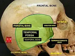 - przyśrodkowo: kość ciemieniowa, część łuskowa kości skroniowej, powierzchnia skroniowa kości czołowej, powierzchnia skroniowa skrzydła większego kości klinowej,