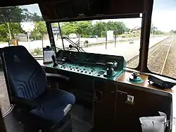 Do kabiny maszynisty z części pasażerskiej prowadzą jednoskrzydłowe drzwi przesuwne bez okna. Zamontowano w niej pulpit sterowniczy oraz fotel o regulowanej wysokości i odległości od kokpitu. Szyby w ścianie czołowej kabiny wykonano ze szkła trójwarstwowego o grubości 10 mm, a w ścianach bocznych ze szkła giętego dwuwarstwowego grubego na 6 mm[3].