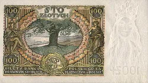 Na rewersie banknotu 100-złotowego, symbolu II Rzeczypospolitej, emitowanego 2 czerwca 1932 r. oraz 9 listopada 1934 r., zaprojektowanego przez Józefa Mehoffera, znajduje się dąb z wiśniowieckiego parku – symbol długowieczności i trwałości[4].