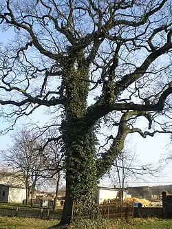 Cały kompleks zabytków znajduje się na niewielkim wzgórzu, przez co wieża kościoła wraz z koronami dębów góruje nad miejscowością.