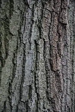 - Zrzucające liście drzewo dorastające do 30 m wysokości. Korona drzewa jest szeroko stożkowa. Gałęzie są proste, tęgie, nieco zgrubiałe w pobliżu pnia. Kora początkowo ma czarną barwę i jest gładka, z wiekiem staje się szara z pomarańczowymi rowkami. Gałązki mają ciemnobrązową barwę z białymi przetchlinkami. Pąki na szczytach gałęzi osiągają 1 cm długości, natomiast boczne 0,5 cm długości[6].