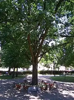 - ↑ Słupki umieszczone są w promieniu ok. 170 cm od pnia drzewa, każdy wysokości ok. 47 cm. Odległości między słupkami to ok. 208 cm. Pomiary wykonano w październiku 2014 r.