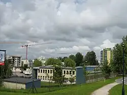 Widok bloków na osiedlu od strony alei Pokoju, od przystanku tramwajowego „Ofiar Dąbia”