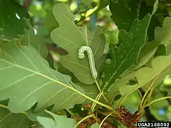Gąsienica charakteryzuje się ubarwieniem zielonym z parą żółtych pręg biegnących bokami ciała[6].