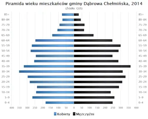• Piramida wieku mieszkańców gminy Dąbrowa Chełmińska w 2014 roku[1].