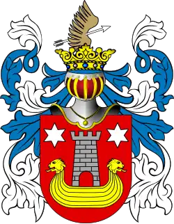 W polu czerwonym na łodzi złotej, zakończonej złotymi głowami lwimi – wieża kamienna okrągła o czterech blankach, z otworem u dołu, po bokach blanków po sześcioramiennej gwieździe srebrnej. Klejnot skrzydło sępie, strzałą srebrną przeszyte. Labry błękitne podbite srebrem,
