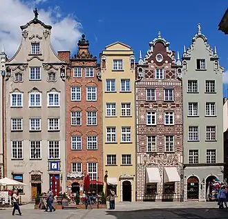 Manierystyczne i barokowe kamienice patrycjuszowskie zostały odbudowane po zniszczeniach wojennych, zachowały część pierwotnej architektury i dekoracji rzeźbiarskiej. Spośród zabudowy wyróżniają się m.in. Złota Kamienica wzniesiona w 1609 przez Abrahama van der Blocke i Jana Voigta dla Jana Speymanna w stylu manieryzmu, zachowała fasadę z dekoracją rzeźbiarską, którą tworzą przedstawienia alegoryczne i symboliczne oraz wizerunki królów; kamienica nr 20 z 1680 z barokową fasadą przypisywaną Andreasowi Schlüterowi; sąsiadujący z Dworem Artusa Dom Ławników mieszczący wewnątrz oryginalną sień z XVI wieku.