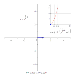 Długość łuku s spirali logarytmicznej w funkcji kata θ, będącego parametrem definiującym spiralę. Długość łuku s jest parametrem naturalnym spirali.