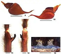 Genitalia samicy mają parę krótkich, trójkątnych spermatek po stronie wewnętrznej wypuszczających od nasady po wierzchołek około sześciu płatów. Nogogłaszczki samca cechują się gruszkowatym bulbusem z krótszym od tegulum, u nasady gwałtownie zwężonym, a w części odsiebnej S-kształtnie wykrzywionym embolusem z małym kilem przedwierzchołkowym. Poza tym samiec ma pierwszą parę odnóży o lekko zakrzywionym nadstopiu oraz o pośrodkowym haku (ostrodze) goleni z dłuższą gałęzią tylno-boczną opatrzoną w połowie długości kolcem i nierozszerzoną w części odsiebnej, a gałęzią przednio-boczną krótszą od stykającego się z nią kolca[3].