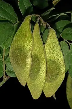 - Strąki zawierające jedno lub kilka nasion. U niektórych gatunków owoce są cienkie, przejrzyste, rozrośnięte wokół nasion tworząc funkcjonalnie skrzydlak. U innych strąki w różnym stopniu drewnieją i grubieją. Nasiona są nerkowate, spłaszczone[8].