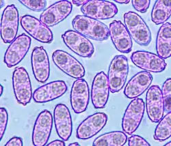 Worki cylindryczne, z 8 zarodnikami w jednym rzędzie, z wierzchołkowym aparatem apikalnym, 170-250(300) x 9-12(15) µm. Parafizy septowane, brązowe, z dużymi płowymi lub brązowawymi granulkami, o średnicy 1,5–2,5 µm, proste lub często lekko zakrzywione i stopniowo rozszerzające się w kierunku wierzchołka do 5–10 µm. Askospory elipsoidalne, drobno brodawkowate i z drobno wydłużonymi grzbietami, czasami siatkowate, z dwoma gutulami, 10–12(15) x 5,5–6,5 µm[3].