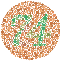 - deuteranopia (tzw. daltonizm) – nierozpoznawanie barwy zielonej (mylenie jej z czerwoną);
