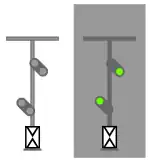 ![]() Ot3 Jedno pomarańczowe i jedno zielone światło na jednym pionie, zwrócone do pociągu |