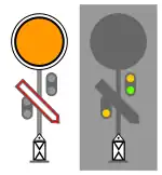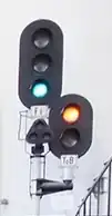 ![]() Sygnał S6 światło zielone i nad nim światło pomarańczowe |