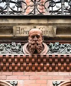 Neogotycki, ceglany budynek został wzniesiony na planie prostokąta wraz z oficynami skupionymi wokół wewnętrznego dziedzińca[2]. Dom frontowy, jest trzykondygnacyjny, dwuipółtraktowy z ośmioosiową elewacją podzieloną barwnymi pasami klinkierowych cegieł i ceramicznymi ornamentami. Pozostała część elewacji pokryta jest jasnym tynkiem. W części dachowej znajdują się trzy schodkowe szczyty, na których umieszczono nazwiska budowniczych, a w osi środkowej wyrzeźbioną głowę architekta Graua na tle jego nazwiska (podobna do tej, która znajduje się na elewacji pałacu Ballestremów)[2]. Pomiędzy szczytami znajduje się balkon[6].