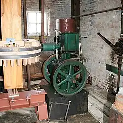 Wiatrak ma jedno piętro, przy czym powstał na jednopiętrowej platformie[1]. Galeria wznosi się na wysokości 4,20m powyżej powierzchni gruntu. Kołpak jest kryty poziomymi deskami. Skrzydła mają rozpiętość 13,10 metrów[1]. Drewniany wał skrzydłowy podtrzymuje skrzydła i napędza górne koło kołnierzowe o 39 trybach[3]. Dolne koło kołnierzowe ma 19 trybów i znajduje się na szczycie wału głównego[2]. U dołu wału głównego znajduje się koło zębate napędzające wał pośredni, połączony pasem z drugim wałem pośrednim. Koło zębate na jego końcu ma 16 trybów i napędza inne koło zębate o 64 trybach, zlokalizowane na osi śruby Archimedesa[2]. Śruba może też być napędzana przez silnik wysokoprężny[3].